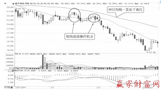 如圖所示,2011年11月,航天信息(600271)的股價多次突破20日封線,出現(xiàn)波段操作機會。不過此時股價和20日均線一直處于60日均線下方,這說明股價長期來右會持續(xù)下跌。因此投資者對這類波段機會應(yīng)該謹讀操作。