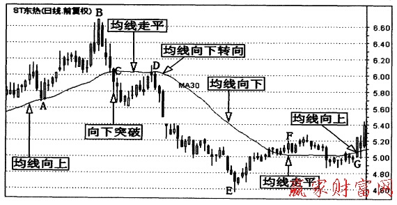 當(dāng)MA30處于下跌趨勢(shì)時(shí),投資者最明智的選擇就是觀望和等待。股價(jià)經(jīng)過(guò)較長(zhǎng)時(shí)間的下跌后,在E點(diǎn)見(jiàn)底并反彈,反彈到F點(diǎn)后.MA30開始走平,這說(shuō)明市場(chǎng)中短期調(diào)整將告一段落。