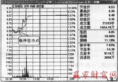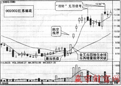 在2004年9月13日最后一次洗盤動(dòng)作之后,出現(xiàn)了向上的攻擊行情。經(jīng)過(guò)了洗盤后的平底陽(yáng)帶上影線的過(guò)度。次日2004年9月15日快速飆升,鎖住漲停。這個(gè)過(guò)度形態(tài)給人一種反彈受阻的無(wú)量無(wú)力的假象。主力最想表現(xiàn)出來(lái)的意圖越是隱蔽,往往是專業(yè)投資者展開捕捉的信號(hào)。該股從底部第一個(gè)漲停突破向上之后。馬不停蹄向上跳空漲停,快速脫離成本區(qū)域,給人以強(qiáng)大無(wú)比的感覺(jué),認(rèn)定是大機(jī)構(gòu)、大手筆操作,給后面順利出貨埋下伏筆。
