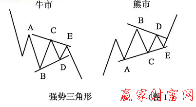 首先是三角形型調(diào)整的變異形態(tài)。分為強(qiáng)勢三角形和前置三角形。