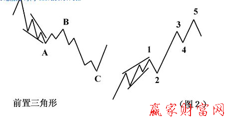 三角形的另外一種變異就是前置三角形。前期傾斜三角形出現(xiàn)在第5浪較多。也會(huì)出現(xiàn)在c浪,內(nèi)部呈現(xiàn)3-3-3-3-3的結(jié)構(gòu),而此種傾斜三角形內(nèi)部結(jié)構(gòu)一般呈現(xiàn)為5-3-5-3-5形態(tài)。一組5浪中,的第一浪走得過急,或者第五浪變換太快,就有可能出現(xiàn)前置三角形態(tài),但是此時(shí)市場形態(tài)沒有強(qiáng)勢三角形的市場強(qiáng)烈。