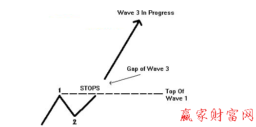 浪3的波動(dòng)獲得了動(dòng)力并且到達(dá)了浪1的頂部。在浪1頂部被突破的同時(shí),那些停損單被觸及了。根據(jù)停損量的大小,將在浪3上產(chǎn)生一個(gè)跳空缺口。在浪3上升的過程中,跳空缺口是一個(gè)好的現(xiàn)象,在停損單被觸及之后,浪3的波動(dòng)將引起交易者的注意。