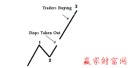 交易者并不確信這是一次向上的趨勢(shì),并且利用這次波動(dòng)增加空頭(shorts)。如果他們的分析是正確的話市場(chǎng)不能到達(dá)前一浪波動(dòng)的頂部。因此,大量的停損單的現(xiàn)象將在浪1頂部上方出現(xiàn)。