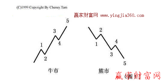 在艾略特波浪理論中,波浪的型態(tài)決定了其性質是推動浪還是修正浪。但是每一個浪的型態(tài)也不完全一樣。在現(xiàn)實情況中,推動浪會因基本面的不同而出現(xiàn)一些變異型態(tài)。但以標準的推動浪來說,它們是五浪推動的,在牛市中是五浪上升,在熊市中是五浪下跌,五浪結束就會運行修正浪(見圖1)。推動浪的變異型態(tài)則有數(shù)個種類。最初艾略特只提出了“浪的延伸”、“失敗的第5浪”、“傾斜三角形”等類型。后來,又有人進一步指出,還有“第二種傾斜三角形”等形態(tài)。