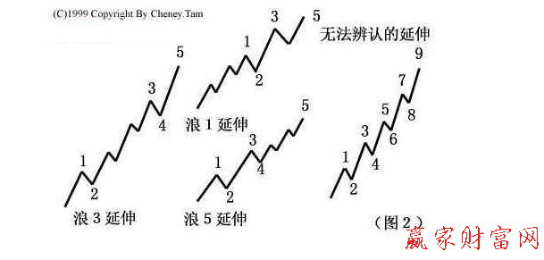 所謂浪的延伸,是指浪的運動發(fā)生放大或拉長的現(xiàn)象。當波浪發(fā)生延伸時,將會使得此一波浪序列形成大小相似的九浪,而如果延伸浪中再出現(xiàn)延伸,則我們會見到十三個大小相似的波浪。根據(jù)我的經驗,在現(xiàn)實中波浪的延伸是經常出現(xiàn)的,也許在未來,浪的延伸會被認為是推動浪的正常型態(tài)。如果在分析中無法辯認是哪一個波浪出現(xiàn)延伸,這不要緊。因為在艾略特的理論體系中,五浪、九浪與十三浪甚至十七浪的意義是一樣的(見圖2)。我們所關心的是波浪的延伸到底給予我們什么好處。一般情況下,三個推動浪中有且僅有一個浪出現(xiàn)延伸。這個事實,使波浪的延伸現(xiàn)象變成了預測推動浪運行長度的一個相當有用的依據(jù)。舉例來說,如果投資者發(fā)覺第3浪出現(xiàn)延伸時,那么第5浪理應只是一個和第1浪相似的簡單結構。或者,當?shù)冢崩伺c第3浪都是簡單的升浪,則有理由相信第5浪可能是一個延伸浪,特別是當成交量急劇增加時。請注意,在成熟的股市,延伸浪經常會出現(xiàn)在第3浪中;而在新興股市中,第5浪往往也出現(xiàn)延伸的現(xiàn)象。