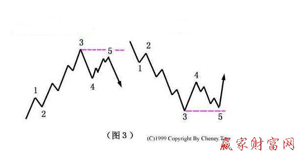 推動浪可以延伸,也可以失敗。艾略特使用“失敗型態(tài)”的字眼,藉以描述第5浪的運動未能突破第3浪終點的價格水平。也有人使用“未完成的第5浪”這個詞表達上述意思(見圖3)。我認為,如果不使用“失敗的”這個詞,則不如使用“未創(chuàng)新高(低)的”。因為“未完成的”很容易讓人誤以為第5浪尚未結束。