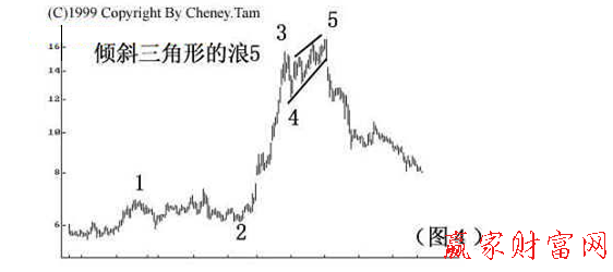 當?shù)冢道瞬荒軇?chuàng)新高(低)時,很可能市場會出現(xiàn)大逆轉。其包含的深層意義,并非在此三言兩語所能說得清楚。要特別提醒讀者的是,在實戰(zhàn)應用中一定要注意第5浪中的次一級5個小浪清晰出現(xiàn)后才可確認此“失敗5浪”。否則,可以演變成“4浪b”,只要它是3浪運行的。“失敗的第5浪”的出現(xiàn),大多數(shù)情況下是由于基本面出現(xiàn)突然的重大變化而造成的。例如,利率變動、戰(zhàn)爭、政變等。不過,單有基本面的變化而第3浪沒有過分揚升的話,則也很難令第5浪失敗。正如現(xiàn)實世界難以完美一樣,股市也經常會出現(xiàn)令人遺憾的地方。除了“延伸”和“失敗”之外,傾斜三角形型態(tài)也是推動浪的變異型態(tài)。相對前兩者來說,這確實是較為少見的。艾略特認為,傾斜三角形為推動浪中的一種特殊型態(tài),主要出現(xiàn)在第5浪的位置。