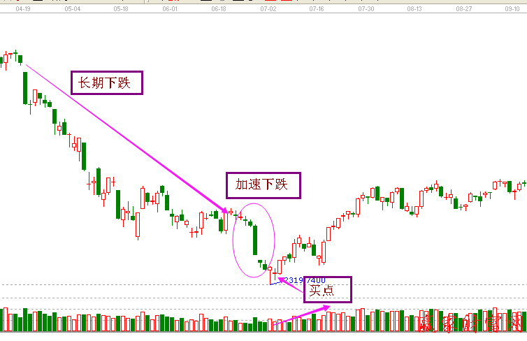 大盤或是個(gè)股在經(jīng)歷長(zhǎng)時(shí)間的下跌之后,會(huì)突發(fā)的出現(xiàn)下跌加速,而后成交量則連續(xù)的增長(zhǎng),這時(shí)候就是大膽買進(jìn)的時(shí)機(jī)。
