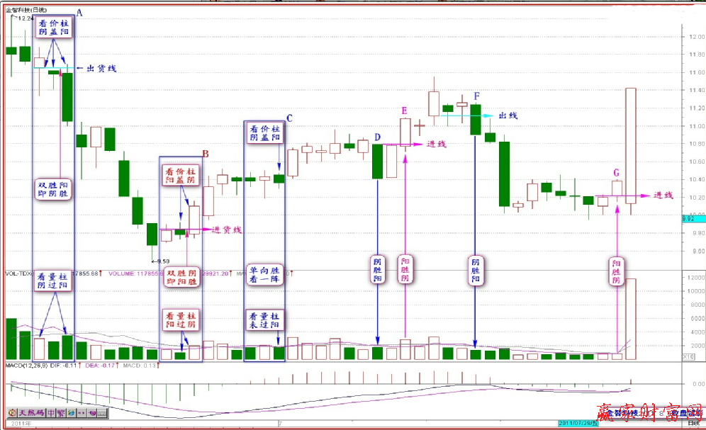 按照上邊的“三句話”的標(biāo)準(zhǔn)來分析的話,只要在左側(cè)的F點進(jìn)去后,幾乎沒有賣出的“陰勝柱”,股價的走勢顯得十分干凈,我們以A點分界,左側(cè)只有F點一個買點,只有G點一個賣點。A點陽勝陰買入之后幾乎很少有其他的明顯的信號了,無論哪個位置進(jìn)去都可以賺到錢。