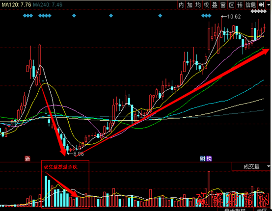 1,在底部時(shí),觀看底部的量能變化,以及反彈的力度和前期下跌的力度,這些都是可以通過成交量的變化大小來反應(yīng)出來的,往往這種類型的票,在下跌前期會(huì)出現(xiàn)大量的量,而且顯得比較急速,殺傷力也比較大,在下跌中期時(shí),量能開始急速萎縮,偶爾會(huì)放一下量,但是量能不大和前期相比,在下跌過程反彈時(shí)成交量變大,下跌無量,在下跌接近尾聲時(shí),成交量基本說下跌無量,反彈放量,這個(gè)可以作為判斷底部形成的一個(gè)依據(jù)。