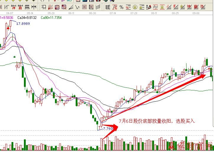 底部的放量止跌說明有抄底資金入場,投資者可在成交量繼續(xù)放量時買入。