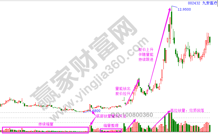 第二,注意觀察成交量變化的可持續(xù)性。個(gè)股的階段性行情必然伴隨著成交量的持續(xù)放大,而在底部階段的持續(xù)縮量整理也是孕育新一波行情的信號(hào)。如果成交量不能持續(xù)放大或縮小,那么其對(duì)股價(jià)上漲和下跌的助推作用也十分有限。對(duì)照九安醫(yī)療的量價(jià)圖形去看,底部區(qū)域持續(xù)縮量,12月10日放量拉漲停釋放資金進(jìn)入信號(hào),即可重點(diǎn)關(guān)注。短期再次縮量蓄勢后,開始逐步放量并伴隨著股價(jià)的快速拉升。2月中旬短線快速回落對(duì)應(yīng)量能萎縮則判定為洗盤動(dòng)作,逢低可以繼續(xù)關(guān)注。之后,再次持續(xù)放量,股價(jià)再次走出翻倍行情。