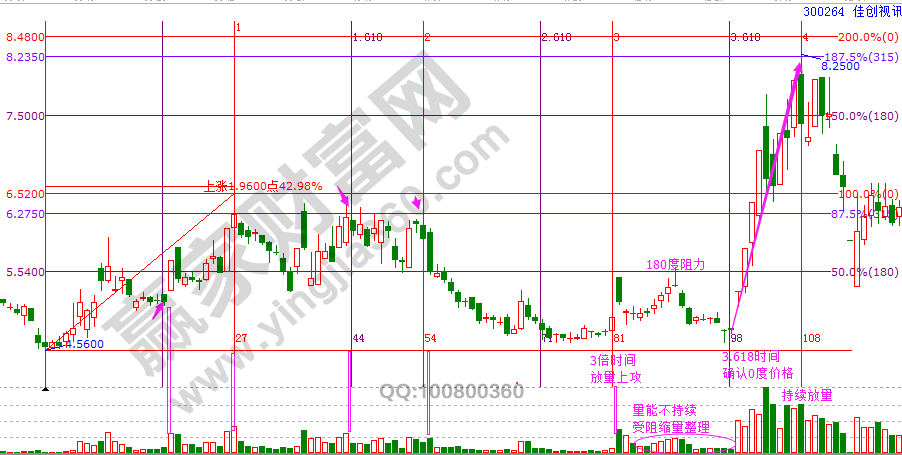 第三,量價(jià)時(shí)空四要素綜合研判。只是單純的靠成交量分析就想找到股票的最佳買賣點(diǎn),不是件容易的事。但,若能將四大技術(shù)要素綜合分析判斷,那么這件不太容易的事卻可以實(shí)現(xiàn)。首先,時(shí)間是第一位的。當(dāng)時(shí)間到達(dá),成交量往往快速放大來助推股價(jià)的漲跌。以佳創(chuàng)視訊為例,以4.56-6.52的這波上漲做時(shí)價(jià)分析圖,3倍時(shí)間窗口股價(jià)回落到0度價(jià)格位,量能放出展開上攻,但未能持續(xù),股價(jià)在180度位置受阻回落??臻g上再次回落到0度價(jià)格位,且3.618時(shí)間窗口到達(dá),時(shí)價(jià)共振,轉(zhuǎn)勢在即。此時(shí),成交量至關(guān)重要,一旦放量拉升則確認(rèn)轉(zhuǎn)勢,應(yīng)果斷順勢買入,后面則是一大波的利潤。