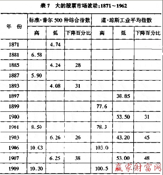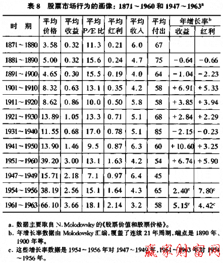理性投資者應(yīng)該了解股市歷史上的一些基本事件。他不應(yīng)想當(dāng)然地以為1949年以前的任何情況都和現(xiàn)在無(wú)關(guān),直到他知道他正在拒絕什么。因此,在表7和表8,我給出了1871年至1963年間股市的一些顯著的數(shù)據(jù)。表7是關(guān)于價(jià)格波動(dòng)的數(shù)據(jù),從熊市的低價(jià)到牛市的高價(jià)再到熊市的低價(jià)。對(duì)于最近的1949年至1963年,我給出了這一大幅上漲時(shí)期中的三次主要回落的數(shù)據(jù);這三次回落──即使幅度最大的一次出現(xiàn)在1962年──也不應(yīng)被認(rèn)為是真正的熊市出現(xiàn)時(shí)的下跌。表8給出了基于收益和股息的有關(guān)數(shù)據(jù),及由此產(chǎn)生的比率。這此將在后面章節(jié)中提及。