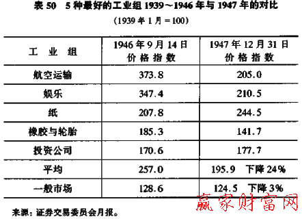 公眾有一個類似的趨勢來投機(jī)于工業(yè)群體,該群體在近來已經(jīng)建立了最好的市場記錄。我們知道,過分看重歷史資料是危險的。表50的數(shù)字或許具有典型性,它們表現(xiàn)了5種在1939年1月至1946年12月運(yùn)行最好的工業(yè)組隨后的市場活動。