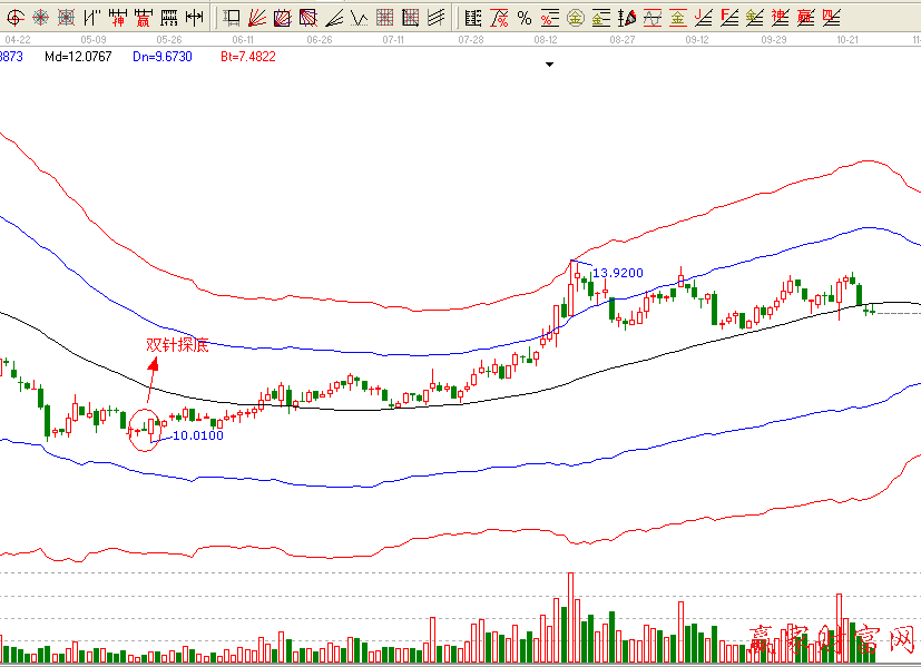 投資者需要注意的是,雙針探底線(xiàn)必須出現(xiàn)在低位,如果所處的位置偏高,即前期的下跌幅度小于20 010時(shí),就應(yīng)慎重操作。雙針探底線(xiàn)中的“兩針”可以是緊密相連的兩根長(zhǎng)下影線(xiàn),也可以是中間隔有幾根K線(xiàn)的“兩針”走勢(shì),但相隔的天數(shù)不能過(guò)多,多于五根以上K線(xiàn)的雙針探底形態(tài),就變成雙底形態(tài)了,但二者操作基本一致。雙針探底線(xiàn)出現(xiàn)后,股價(jià)一般是立即反彈,走出一波氣勢(shì)不凡的上漲行情。但有的股票在雙針探底形態(tài)出現(xiàn)后,僅向上“虛晃一槍”就跌了下來(lái),經(jīng)過(guò)一段時(shí)間的調(diào)整后,才正式展開(kāi)上升攻勢(shì)。碰到這一情況時(shí),投資者應(yīng)耐心等待,適時(shí)還可補(bǔ)倉(cāng)。