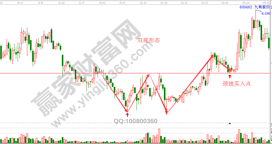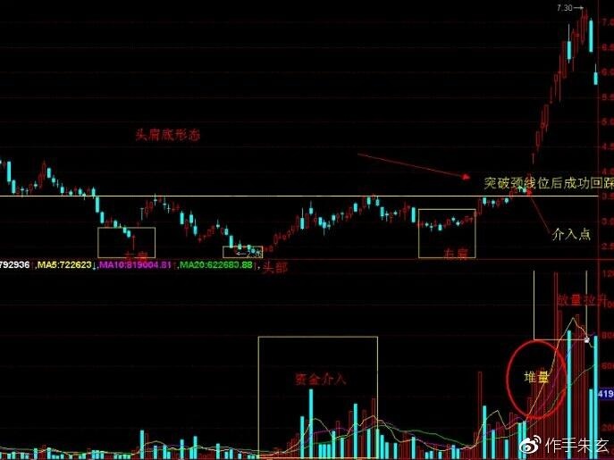 頭肩底形態(tài)的買(mǎi)入位置,1、對(duì)于激進(jìn)者而言買(mǎi)點(diǎn)在股價(jià)向上突破本輪下降趨勢(shì)線時(shí),此為博弈型買(mǎi)點(diǎn)。2穩(wěn)健性買(mǎi)點(diǎn),在股價(jià)向上放量突破頸線位再次回踩頸線支撐時(shí),如上圖箭頭所指位置。在形態(tài)的運(yùn)行中,需要重點(diǎn)留意堆量的形成,堆量是主力介入的標(biāo)志,需要注意,股價(jià)一旦突破頸線位,回踩不破,后期的上升幅度是很可觀的。