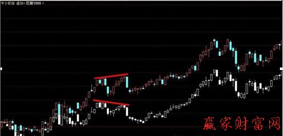 中國股市并沒有這兩個指數(shù),那么道氏理論的指數(shù)互相驗(yàn)證理論在中國股市如何應(yīng)用呢?我們將代表小指數(shù)的399005中小板指和代表大指數(shù)的399311巨潮1000疊加起來,進(jìn)行技術(shù)分析。如果觀察到他們兩者之間的背離(不是經(jīng)常有,幾年當(dāng)中才會有屈指可數(shù)的幾次明顯的背離),就一定要對指數(shù)未來的走勢提高警惕。