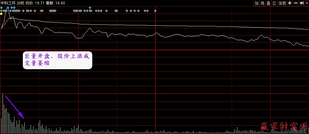 成交量的萎縮就表示買盤越來越小,這樣就會造成股價的回落。開盤時候形成的巨大成交量,那么是誰在賣,除了主力擁有比較多的股票還會有誰?不難看出這巨量就是主力的出貨行為。