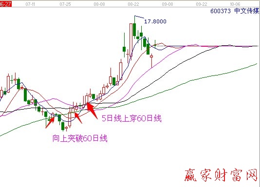 3、60日均線對(duì)與處于之下的個(gè)股也存在阻力。在放量突破后,會(huì)有回踩來確認(rèn)這個(gè)支撐的的有效性。那么這也就是說我們介入股票的時(shí)候要等回踩,不可提前買入。之所以這樣做,會(huì)存在股票跌破60日線,在跌破三日內(nèi)拉回來,這時(shí)候也可以說是確認(rèn)了支撐的有效。在收回60日均線以及第一次出現(xiàn)陽線都可以認(rèn)為站穩(wěn)60日均線,在之后一日出現(xiàn)陰線,再次確認(rèn),第三日出現(xiàn)陽線或者不新低這時(shí)候才是買入股票的介入點(diǎn)。當(dāng)上穿5日現(xiàn)的時(shí)候時(shí)加倉的介入點(diǎn)。大約有70%的股票會(huì)出現(xiàn)這樣的情況。比如最近的中文傳媒(600373)如下: