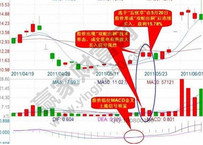 如上圖所示,該股就形成了非常典型的雙蛇出洞的技術(shù)形態(tài),同時(shí)我們還可以看到成交量也有所放大,顯然是很好的買入信號(hào),于是在雙蛇觸動(dòng)的后進(jìn)行買入,在上漲獲得利潤的時(shí)候進(jìn)行賣出。