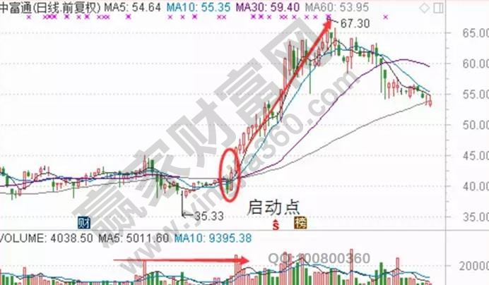 這個右上角強勢進攻型的股上漲利潤空間是非常大的,如下面的中富通走勢圖。股價的啟動點在短期線金叉中軌后放出三倍量平臺突破,這種票的爆發(fā)力來自前面箱體或者平臺的拉鋸洗盤的蓄勢,止損以短期線作為保護即可;一般來說股價在右上角附近徘徊獲利與解套的風險壓力較大,但是反作用力也大。