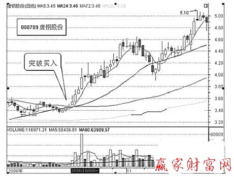 唐鋼股份是鋼鐵板塊當中活躍的一個股票。從圖中可以看出,該股在均線粘合在一起的時候,出現(xiàn)了“三線合一”的買入信號,然后在反復震蕩后又出現(xiàn)了“突破買入”的信號,這時我們從形態(tài)上看是三角形突破向上,這個時候就是一個買點。