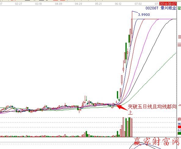成交量一直都很小很小,可以說(shuō)是不起眼的,但是進(jìn)入六月份,該股有所變化。首先,從均線上看,均線開(kāi)始粘合形成向上的趨勢(shì),均線五條線都發(fā)散向上說(shuō)明這股的趨勢(shì)要改變了,同時(shí)提醒投資者要注意這個(gè)股票,聰明的投資者都會(huì)在股票剛啟動(dòng)的時(shí)候介入該股。因?yàn)橛匈I(mǎi)入的信號(hào),通過(guò)均線可以看出,股價(jià)上穿五日線,膽大的都介入了,如果比較穩(wěn)健的可以等回踩不破五日線的時(shí)候介入。這個(gè)時(shí)候買(mǎi)入,只要不破五日線,就耐心持股。結(jié)果該股不負(fù)眾望,沿著五日線上漲,創(chuàng)出新高,走出翻倍的行情。