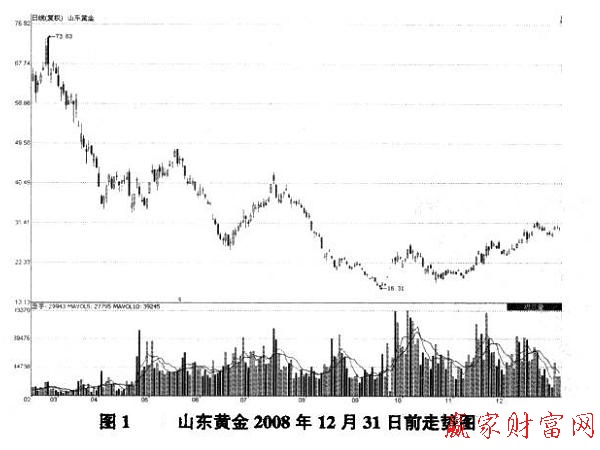 大家都知道在2008年開始出現(xiàn)經(jīng)濟危機。我們可以從其中來看出通貨膨脹中怎么尋找黑馬。圖1為山東黃金2008年12月31日前走勢圖,兩只股均處于大幅下跌后的止跌回升的形態(tài)中,筑底跡象明顯。我國于200年11月發(fā)布了“4萬億經(jīng)濟振興方案”,這一刺激方案是針對2008年全球經(jīng)濟危機所帶來的不利于經(jīng)濟發(fā)展的局面實施的,而且在此期間各國政府也相繼出臺了大量的刺激方案。如果留意新聞,我們在此期間是可以經(jīng)常聽到動輒“幾千億美元的刺激方案”或是“幾千億英鎊的刺激計劃”。