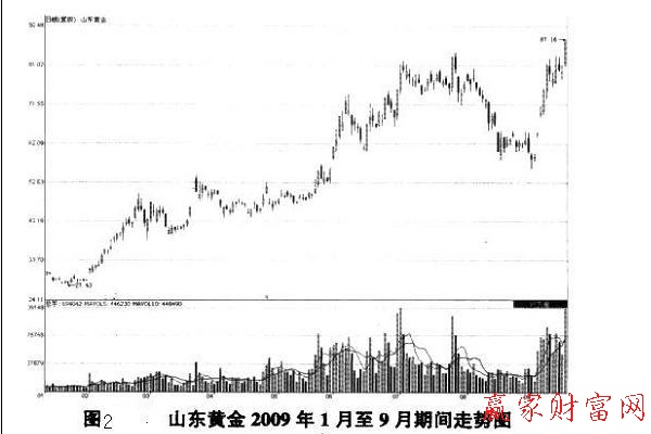 圖2為山東黃金2009年1月之9月期間走勢。從圖中可以看到,在2009年全球通脹預(yù)期普遍升溫的情況下,這兩只黃金類個股的走勢也是極為凌厲的,都走出了數(shù)倍的漲幅,而這種上漲既不是源于業(yè)績的提升,也不是源于重大的資產(chǎn)注入事項,僅僅是由大眾的一種“預(yù)期”導(dǎo)致的,這種預(yù)期就是通脹預(yù)期。