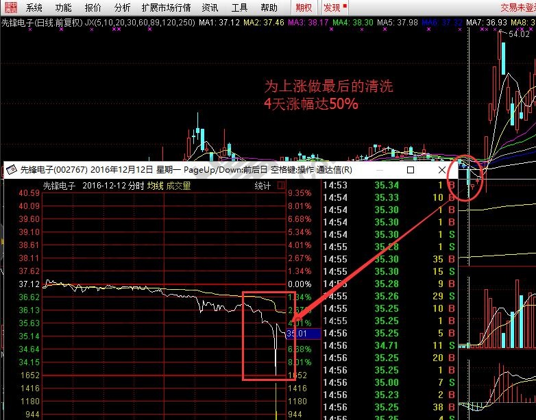 該股突破后并且快速拉,而是小幅上沖后進行回落,因為是新股主力和散戶籌碼都在相對的位置,因此莊家要洗浮籌為后期的上漲做準備,經過半年的震蕩,主力選擇在2016年12月12號做最后的清洗,尾盤小單砸跌停,股民發(fā)現破位爭先賣入然后在主力順利接貨,未來幾個交易日止跌先未拋籌的人在自由的交易后,12月16號開始上漲,短短四天上漲50%之多。