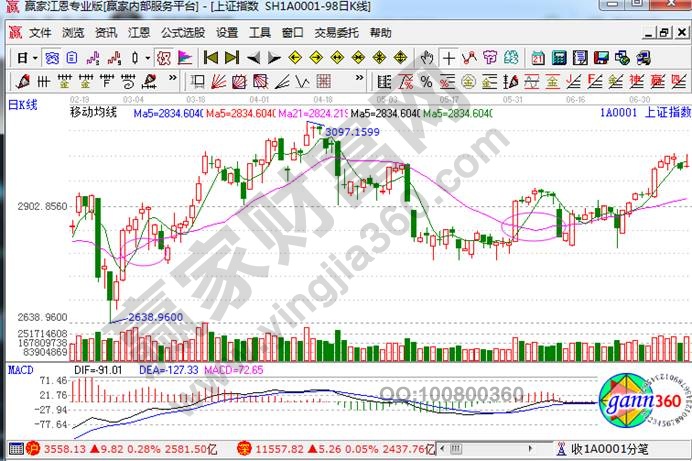 在均線指標中,5日均線是最能夠判斷漲跌動能強弱的一條均線,所以它又被稱為是漲跌動能線,而本文所要說的21日均線,它則是進出決策線,在相應(yīng)的實戰(zhàn)圖形中,它的作用是簡單那有效的,而且21日均線單獨用起來的時候也能夠做到輕松操盤的。當然這兩條線如果集合起來,那就更能夠發(fā)現(xiàn)其中的定律。我們來看一下上證指數(shù)走勢圖。