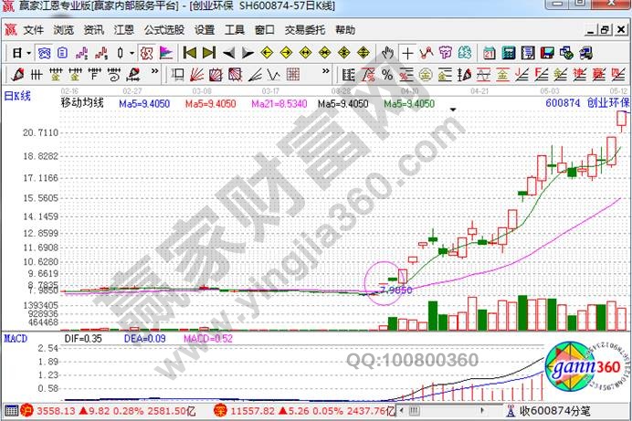 從上圖我們可以看到,在大盤上漲的之后,是有個共同點的,那就是5日均線上穿21日均線或者是股價回調(diào)到21日均線處之后,再次上漲。那這可以不可以作為我們捕捉黑馬股的依據(jù)呢?接下來我們就來創(chuàng)業(yè)環(huán)保的走勢圖。