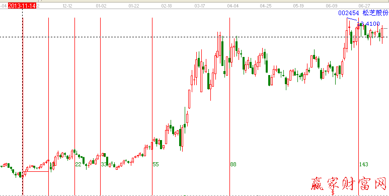 上圖是松芝股份002454從2013年11月14日作為低點(diǎn),11月29日高點(diǎn)作為終點(diǎn)作圖。之后可以看出,在之后的高點(diǎn)低點(diǎn)都顯示在時(shí)間窗口上。