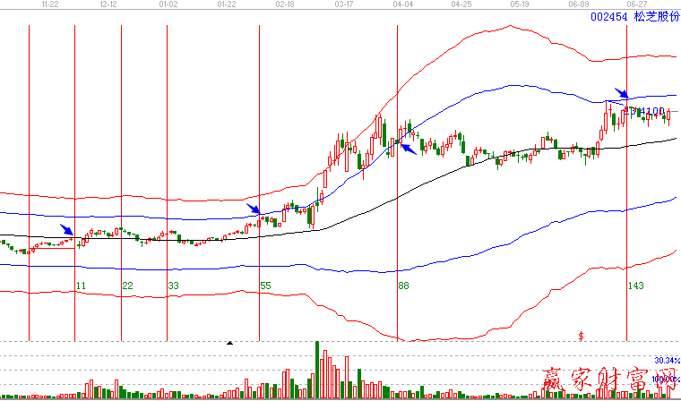 費(fèi)氏時(shí)間周期線,從名稱就可以知道此工具加入了周期,這就表明這個(gè)工具作出的圖形是不一樣的,每個(gè)股票都有自己的周期,也會(huì)遵循這個(gè)周期走下去。關(guān)于費(fèi)氏時(shí)間周期線的用法在工具使用說明中已近有過表述,跟其他的時(shí)間工具使用方法是一致的。我們以贏家江恩軟件工具費(fèi)氏時(shí)間周期線為例作圖,如下: