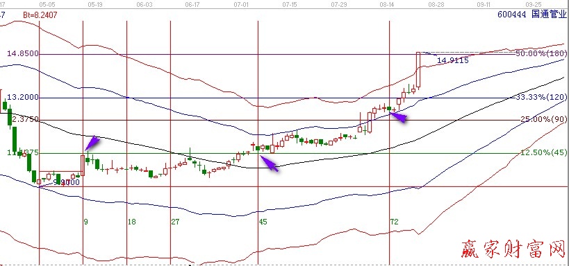 在圖中運(yùn)用有三個(gè)工具,時(shí)間工具——費(fèi)氏時(shí)間周期線;價(jià)格工具——江恩價(jià)格百分比;趨勢(shì)工具——極反通道。國(guó)通管業(yè)具體操作是符合極反通道一種買點(diǎn),那就是超跌反彈的買點(diǎn)。在2014年4月29日出現(xiàn)了階段性的低點(diǎn),這個(gè)位置正好在極反通道的下軌線位置獲得支撐。因?yàn)樽鰰r(shí)間工具的時(shí)間我們選點(diǎn)是這個(gè)低點(diǎn)和之后的高點(diǎn)位置,我們不在這位置作分析。
