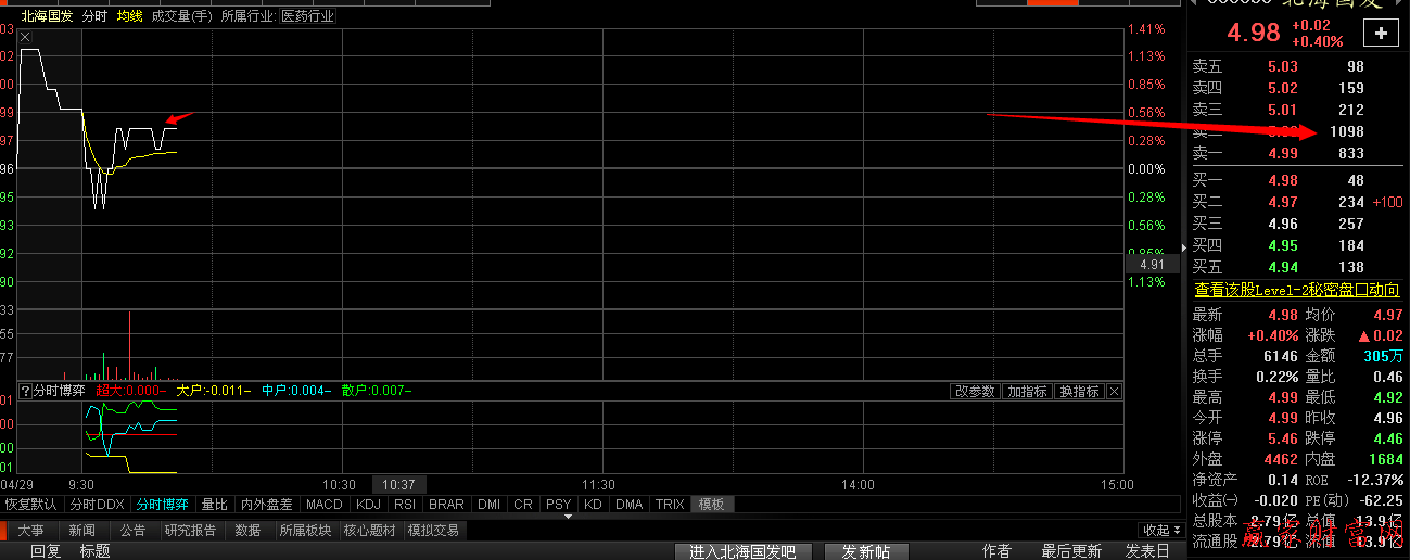 此案例中只限于說明大單的影響,不具備超級短線巨量壓單的案例說明。在上午9點(diǎn)50分股價在4.98元,此時股價在波動過程中出現(xiàn)大單:1098筆??梢钥闯鲞@是圖中顯示委托單的平均4倍,因此確定他對此后的股價上升有重要影響。若此時大賣單沒有撤掉,并且沒有出現(xiàn)較大的買單將他吃掉,股價會在大賣單的價處停止上漲,出現(xiàn)調(diào)整或者下跌。在此次實(shí)戰(zhàn)中,緊接著之后的20分鐘里,大賣單沒有撤出,有買家進(jìn)入將大單吃掉,所以后期股價上漲。