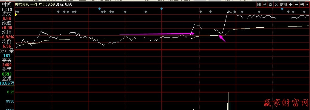 這里的平臺突破包含以下特征:股票的價格在某一位置盤整超過半小時;同時股票價格的走勢貼著均價線的走勢,兩者大致處于同一水平線上,這時候股票波動幅度比較??;這時候均價線也是基本上呈一水平線,幾乎沒有波動;均價線向上越過平臺的最高點后買入。比如2014年9月18日魯抗醫(yī)藥(600789)的分時圖。