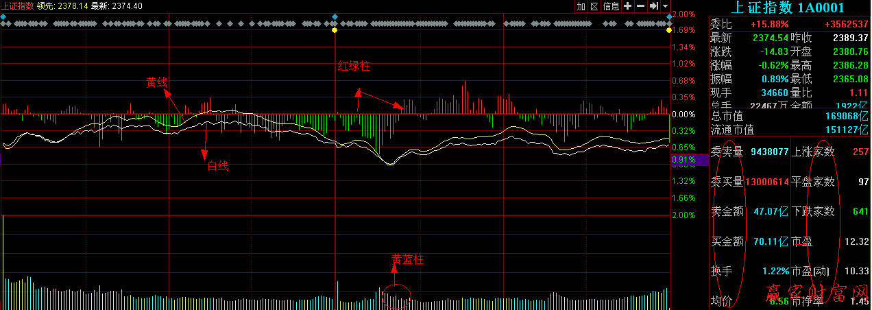 4)黃色柱線:在紅白曲線圖下方,用來(lái)表示每一分鐘的成交量,單位是手(每手等于100股)。