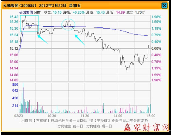 上圖是分時(shí)圖走勢(shì)形態(tài)的壓力作用,這是分時(shí)圖技術(shù)的難點(diǎn)之一。也是我們學(xué)習(xí)分時(shí)戰(zhàn)法時(shí)需要注意的一點(diǎn)。所謂分時(shí)圖走勢(shì)形態(tài)的壓力作用,是指分時(shí)圖走勢(shì)在某一個(gè)時(shí)間節(jié)點(diǎn)上形成了某種形態(tài)之后,隨后的走勢(shì)往往受到它的壓制,股價(jià)運(yùn)行到它的附近時(shí), 會(huì)出現(xiàn)回落。