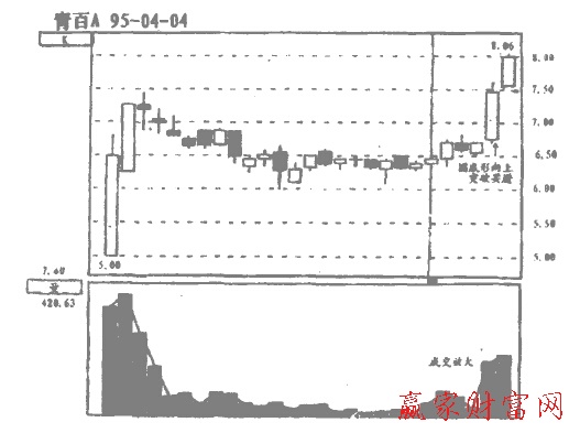 在實戰(zhàn)中,根據(jù)圓頂(底)決策買賣首先要注意的是思維方向。當圓頂形態(tài)跡象出現(xiàn),思維上應(yīng)先考慮賣出而不是買進,一旦向下突破,清倉離市為上策,若投資者在下跌趨勢形成時賣出,可以避免30%左右的跌幅所造成的損失,保存了實力,為以后抄大底提供了必不可少的資金條件。少虧30%,下跌之后又增加獲利30%的機會,正反累計幅度己非常之大.而圓底出現(xiàn)時留意買進機會又非常重要,1995年4月,青百A經(jīng)過20天左右的波動形成一個圓底形態(tài),在大勢沒有什么行情的形態(tài)下,青百A發(fā)力向上40%左右(如圖3-6), 5月18日發(fā)動行情之前,青百A再度呈現(xiàn)圓底式移動.隨后兩日股價由6元多升至12元以上,升幅接近100%。上述事例顯示,圓形頂(底)在實戰(zhàn)中能夠有效地幫助我們選擇買賣時機。從圖表上看,n次突破出現(xiàn)必然伴隨量的放大,所以,研判突破是否成立還應(yīng)注意量的變化.