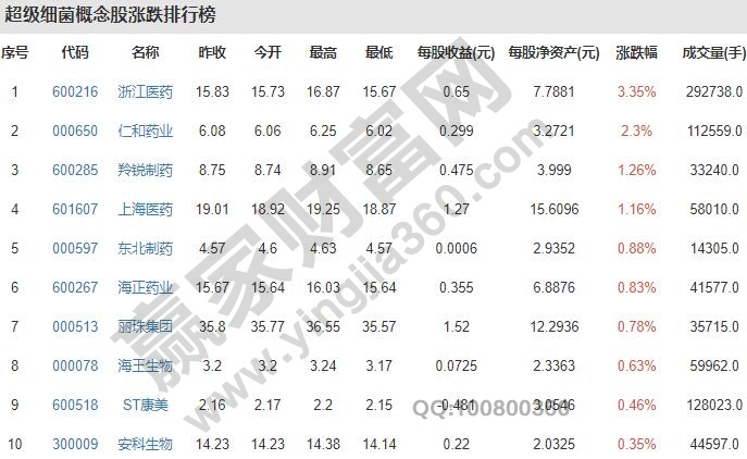 除此之外,超級細(xì)菌概念股還包括東北制藥000597、海正藥業(yè)600267、麗珠集團(tuán)000513等上市公司,更多相關(guān)內(nèi)容大家可以關(guān)注贏家財富網(wǎng)概念欄目。