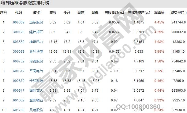 其個(gè)股包括:安靠智電300617、長(zhǎng)高集團(tuán)002452、許繼電氣000400、平高電氣600312、中環(huán)裝備300140、通達(dá)股份002560、大連電瓷002606、置信電氣600517、智慧能源600869、匯金通603577、特變電工600089、中國(guó)西電601179、東材科技601208、內(nèi)蒙華電600863、風(fēng)范股份601700、電科院300215、新宏泰603016、 國(guó)電南瑞600406、漢纜股份002498、國(guó)電南自600268、中天科技600522、河鋼股份000709、夢(mèng)網(wǎng)集團(tuán)002123、雅百特002323、東方鐵塔002545、保變電氣600550