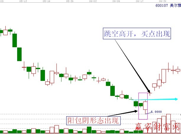 一般情況下,陰包陽吞沒形態(tài)出現(xiàn)后,如果在第二天繼續(xù)上漲,,而且股價快速突破陽線高點(diǎn),形成買點(diǎn)。下面以個股展示下該形態(tài)操作,以上證個股美爾雅(600107)為例,如下圖,該股在經(jīng)歷了一波下跌之后,在2008年9月18日收盤形成陽包陰的K線形態(tài),這就預(yù)示這該股票可能要見底了,是很明確的看漲信號。而第二天該股繼續(xù)強(qiáng)勢高開,因此形成買點(diǎn),投資者可以積極參與買進(jìn)。