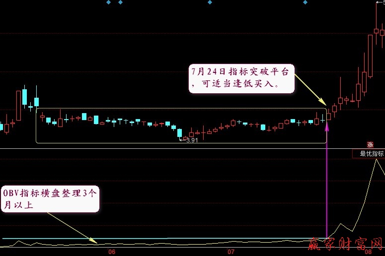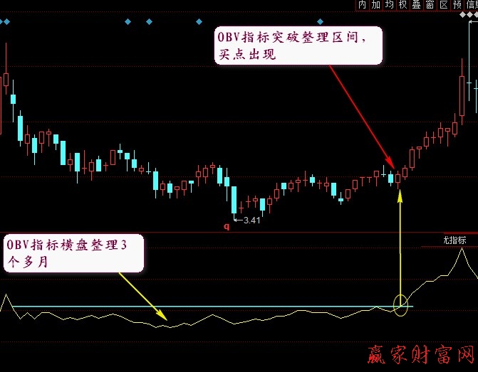 OBV指標(biāo)熟悉的朋友大多也知道如何利用該指標(biāo)進行股票的買賣,筆者今天就介紹其中一種買入方法,即OBV指標(biāo)橫盤整理時間超過3個月,突破整理區(qū)間時即可買入股票。具體如下: