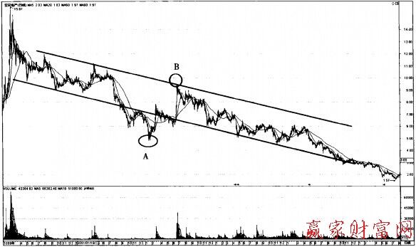 很多時候股價跌破下降通道的下軌,必然引起市場的恐慌情緒,于是殺跌者蜂擁而出。經(jīng)此一波急跌,持幣者不敢入場,持籌者或不壓賣或賣不出去,于是股價有了一個相對有利的上漲空間,這就是次級反彈形成的市場原因。換句話說,次級反彈是為了接下來更好地下跌應(yīng)運而生的一次上漲行情。B點,行情終止于下降通道的上軌處,之后股價繼續(xù)維持下跌態(tài)勢。