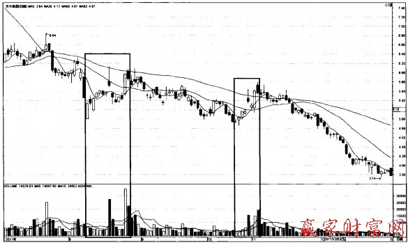 次級反彈是熊市中期的亮點,但除此之外,中期的很多短線反彈行情并不具備操作條件,交易者介入也僅僅是一次“參賭"行為。如圖中所標示處,僅有1元左右的反彈空間。很難保證交易者能在其中獲得利潤。