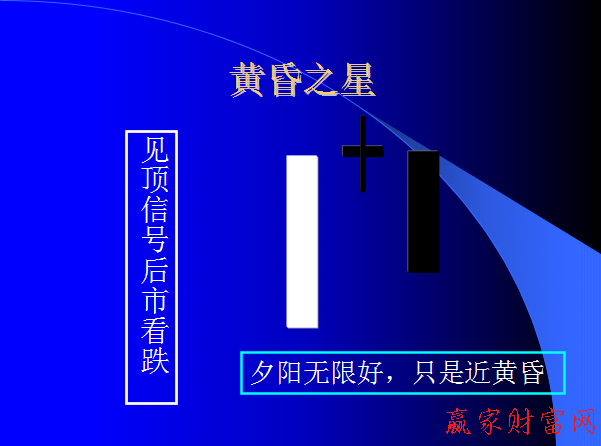黃昏之星:市場在持續(xù)的漲勢之后,已激情不再,就像再好的筵席也有散場之時。黃昏之星的圖形,預示市場趨勢已經(jīng)見頂,賣出的時機悄然來監(jiān)。