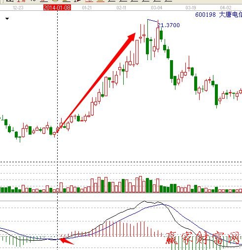 如圖所示,DIF線上穿DEA線(白線上穿黃線)后,形成MACD金叉形態(tài),伴隨著成交量的逐漸增加,股價(jià)一路上漲。如果投資者在MACD金叉形成并且成交量放大時(shí)介入,將獲利頗豐。