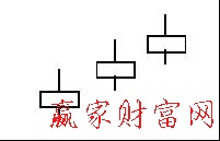 (八)三個紅小兵組合在低檔區(qū)出現(xiàn)這種連續(xù)三個小陽線上升的組合時,表示市勢已經(jīng)走出長期的下跌陰影,步上反彈上升路途。